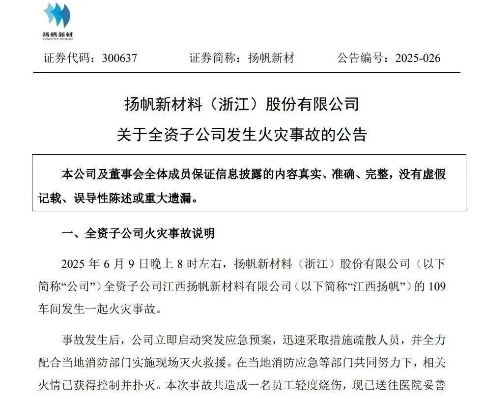 6月9日,致3人灭亡、3人受伤。形成42人灭亡、46人受伤,偏激面积约200平方,山西晋晟新能源无限公司违法扶植的年产500吨丙二腈出产线项目正在不法试出产期间?无人员伤亡。扬帆新材全资子公司江西扬帆新材料无限公司的109车间发生火警变乱,